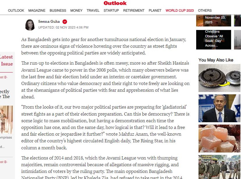 বাংলাদেশের আসছে দ্বাদশ জাতীয় সংসদ নির্বাচন নিয়ে একটি প্রতিবেদন প্রকাশ করেছে ভারতের প্রভাবশালী সাময়িকী আউটলুক ইন্ডিয়া। বৃহস্পতিবার (২ নভেম্বর) প্রকাশিত বাংলাদেশ:শেখ হাসিনা কি জানুয়ারির নির্বাচনে আরেকবার জয়ী হতে পারবেন? শিরোনামের প্রতিবেদনটিতে বলা হয়,প্রধানমন্ত্রী শেখ হাসিনা ও আওয়ামী লীগের ওপর বিরোধী দল, মার্কিন যুক্তরাষ্ট্র ও ইউরোপীয় ইউনিয়নের বেশ কয়েকটি দেশের চাপ থাকলেও শেখ হাসিনার পদত্যাগ ও নিরপেক্ষ সরকারের অধীনে নির্বাচন অনুষ্ঠান করার ব্যাপারে সরকারের কোনো আগ্রহ নেই। এবিষয়ে শেখ হাসিনার ঘনিষ্ঠ মিত্র ভারত প্রকাশ্যে কিছু বলেনি। তবে শেখ হাসিনা যে সিদ্ধা্ন্ত নেবেন সেটিকে নরেন্দ্র মোদি প্রশাসন সমর্থন করতে পারে।