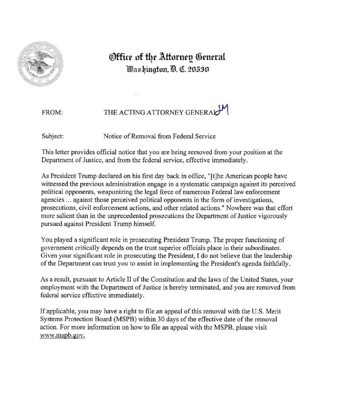 ভারপ্রাপ্ত অ্যাটর্নি জেনারেল জেমস ম্যাকহেনরি একটি চিঠিতে জানিয়েছেন, ‘প্রেসিডেন্ট ট্রাম্পের বিচারে আপনাদের গুরুত্বপূর্ণ ভূমিকা বিবেচনায়, আমি মনে করি না যে রাষ্ট্রপতির এজেন্ডা বাস্তবায়নে আপনাদের ওপর পুরোপুরি ভরসা করা সম্ভব।’
