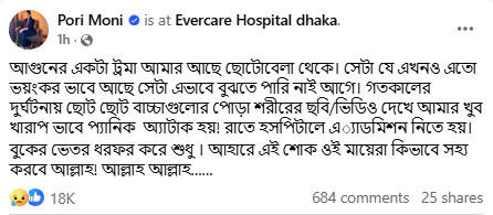 মঙ্গলবার (২২ জুলাই) দুপুরে নিজের ফেসবুক স্ট্যাটাসে পরীমণি লিখেছেন, “আমার ছোটবেলা থেকেই আগুনের প্রতি একটা ভয় কাজ করে। সেটা যে এখনও এতটা তীব্রভাবে রয়ে গেছে, বুঝতেই পারিনি। গতকালের ঘটনায় ছোট ছোট বাচ্চাগুলোর পোড়া শরীর দেখে আমার বুকটা যেন চেপে ধরল। দম বন্ধ হয়ে যাচ্ছিল, সব কেমন অন্ধকার মনে হচ্ছিল।”