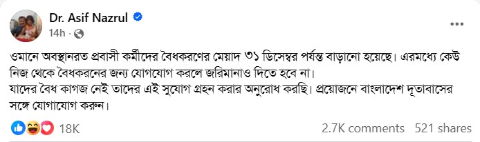 অধ্যাপক আসিফ নজরুল তার ফেসবুক পোস্টে প্রবাসীদের প্রতি আহ্বান জানান, যাদের বৈধ কাগজ নেই, তারা যেন সুযোগটি কাজে লাগান এবং প্রয়োজনে ওমানে বাংলাদেশ দূতাবাসের সঙ্গে যোগাযোগ করেন।