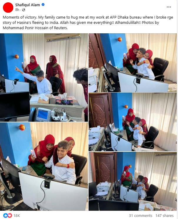 শফিকুল আলম আরও বলেন, পুরো ঘটনার বর্ণনা লিখে দিলাম। তখনই আমাদের রিপোর্ট ব্রেকিং হলো। বাংলাদেশের প্রায় সব পত্রিকা ও অনেক টিভি চ্যানেল এএফপির ক্লায়েন্ট। তারা ব্রেকিং হিসেবে এএফপি সূত্রে শেখ হাসিনার চলে যাওয়ার খবর প্রকাশ করে। এরপর আমি অসংখ্য ফোন পেতে শুরু করি। এতে আমি আরও টেনশনে পড়ে যাই, কারণ আমার সংবাদ তো আন্তর্জাতিকভাবে ছড়িয়ে গেছে। তখন টেনশনে আমি সুরা কেরাত পড়া শুরু করি। কারণ, যদি এমন হতো যে তিনি ফিরে এসেছেন, তাহলে তো আমার জীবনই শেষ!