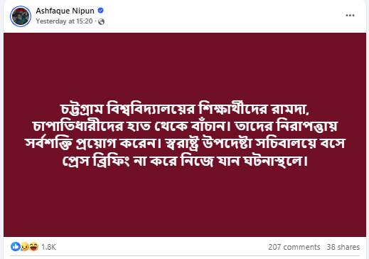 রোববার (৩১ আগস্ট) নিজের ভেরিফাইড ফেসবুক পেইজে জনপ্রিয় নির্মাতা আশফাক নিপুন শিক্ষার্থীদের নিরাপত্তা নিশ্চিত করার আহ্বান জানিয়েছেন।