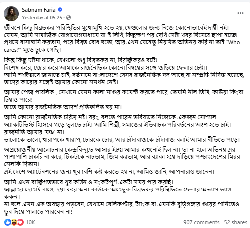 শনিবার (০৬ সেপ্টেম্বর) নিজের ভেরিফাইড ফেসবুক পেইজে এক পোস্টে ফারিয়া জানিয়েছেন, বর্তমান বা সম্প্রতি নিষিদ্ধ যেকোনো রাজনৈতিক দলের সঙ্গে আমার কোনও সম্পর্ক নেই। আমার পেজ সবার জন্য উন্মুক্ত। এখানে যেকোনো মন্তব্য আসতে পারে কেউ কালা মাগুর, কেউ নীল তিমি বা কাউয়া কিন্তু সেগুলো আমার রাজনৈতিক অবস্থানের প্রতিফলন নয়।
