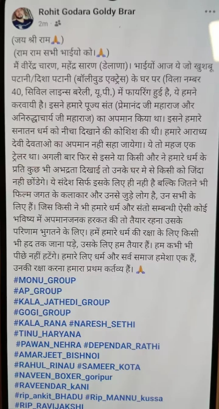 এদিকে গোল্ডি ব্রার চক্র ফেসবুকে একটি পোস্ট দিয়ে হামলার দায় স্বীকার করেছে। তাদের দাবি, দিশা এবং তার বোন আধ্যাত্মিক গুরু প্রেমানন্দ মহারাজ ও অনিরুদ্ধাচার্য মহারাজকে অসম্মান করেছেন। এ কারণে তারা হামলা চালিয়েছে।