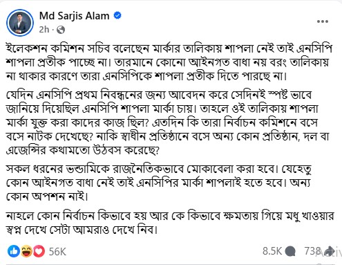 জাতীয় নাগরিক পার্টির (এনসিপি) উত্তরাঞ্চলের মুখ্য সংগঠক সারজিস আলম বলেছেন, যেহেতু কোন আইনগত বাধা নেই তাই এনসিপির মার্কা শাপলাই হতে হবে। অন্য কোন অপশন নাই।