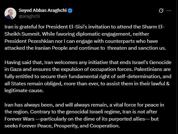 সামজিক যোগাযোগমাধ্যম এক্স দেয়া পোস্টে ইরানের পররাষ্ট্রমন্ত্রী আব্বাস আরাঘচি বলেন, ‘মিশরের পর্যটন শহর শারম আল-শেখের শীর্ষ সম্মেলনে ইরানকে আমন্ত্রণ জানানো হয়েছিল, কিন্তু আমি বা ইরানের প্রেসিডেন্ট কেউই এমন প্রতিপক্ষের নেতাদের সাথে বসতে পারি না, যারা ইরানের জনগণের ওপর আক্রমণ চালিয়েছে, আমাদের হুমকি দিচ্ছে নিষেধাজ্ঞা আরোপ করেছে।’