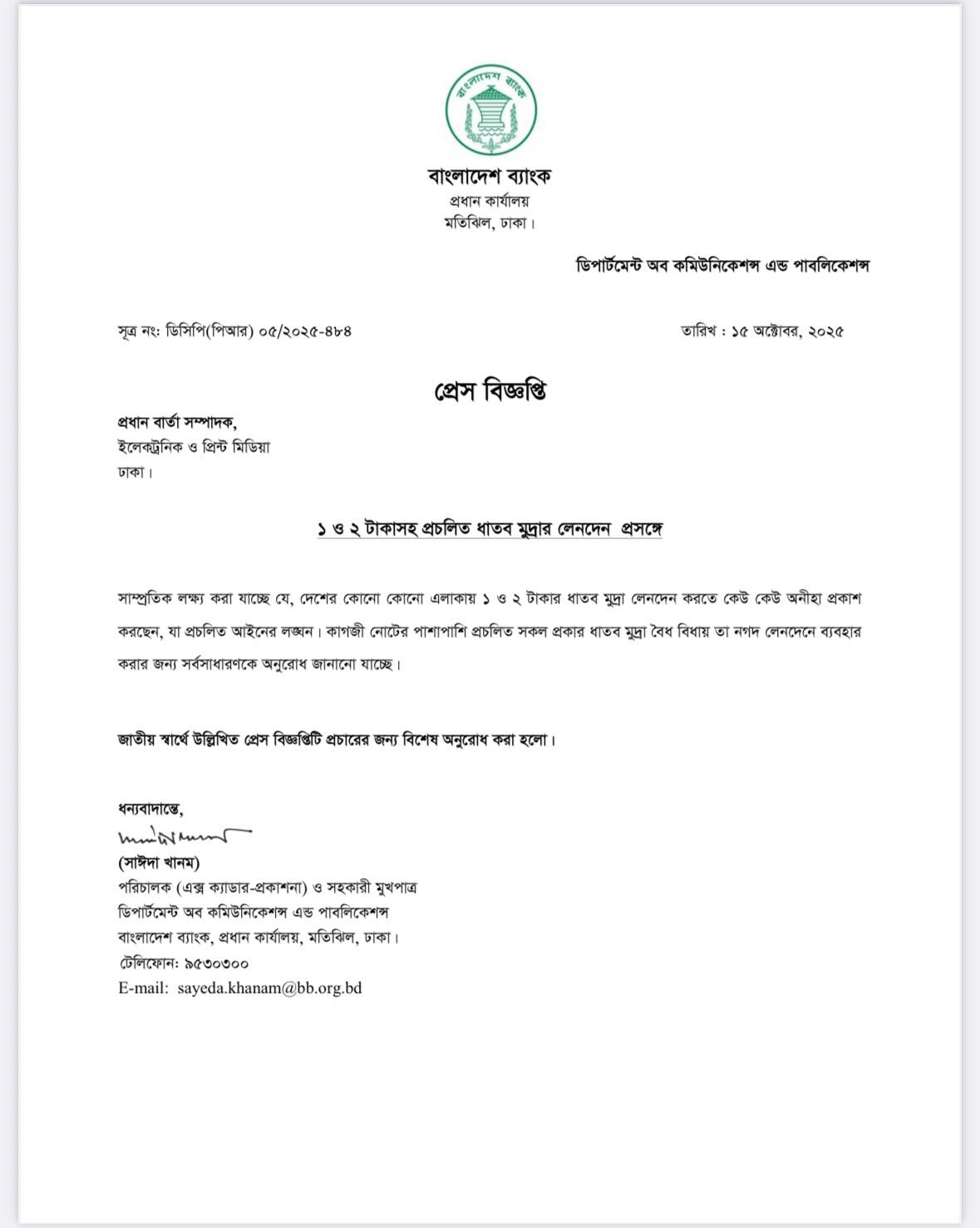 ১ ও ২ টাকার কয়েন নিয়ে বাংলাদেশ ব্যাংকের জরুরি বিজ্ঞপ্তি