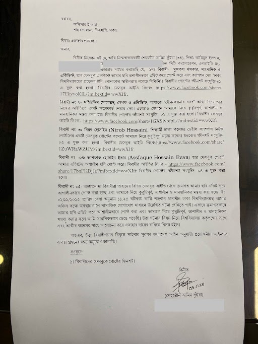 সেখানে তিনি লিখেছেন, শেহরীন আমিন ভুইয়া ম্যাম তার ছবি এডিট করে ফেসবুকে পোস্ট করা ব্যক্তিদের বিরুদ্ধে শাহবাগ থানায় সাইবার সুরক্ষা আইনে মামলা করেছেন। আইন ও মানবাধিকার সম্পাদক হিসেবে আমি সার্বিক সহায়তা করেছি। উপস্থিত ছিলেন ডাকসুর কমনরুম ও ক্যাফেটেরিয়া সম্পাদক উম্মে সালমা এবং মুক্তিযুদ্ধ ও গণতান্ত্রিক আন্দোলন সম্পাদক ফাতিমা তাসনিম জুমা।