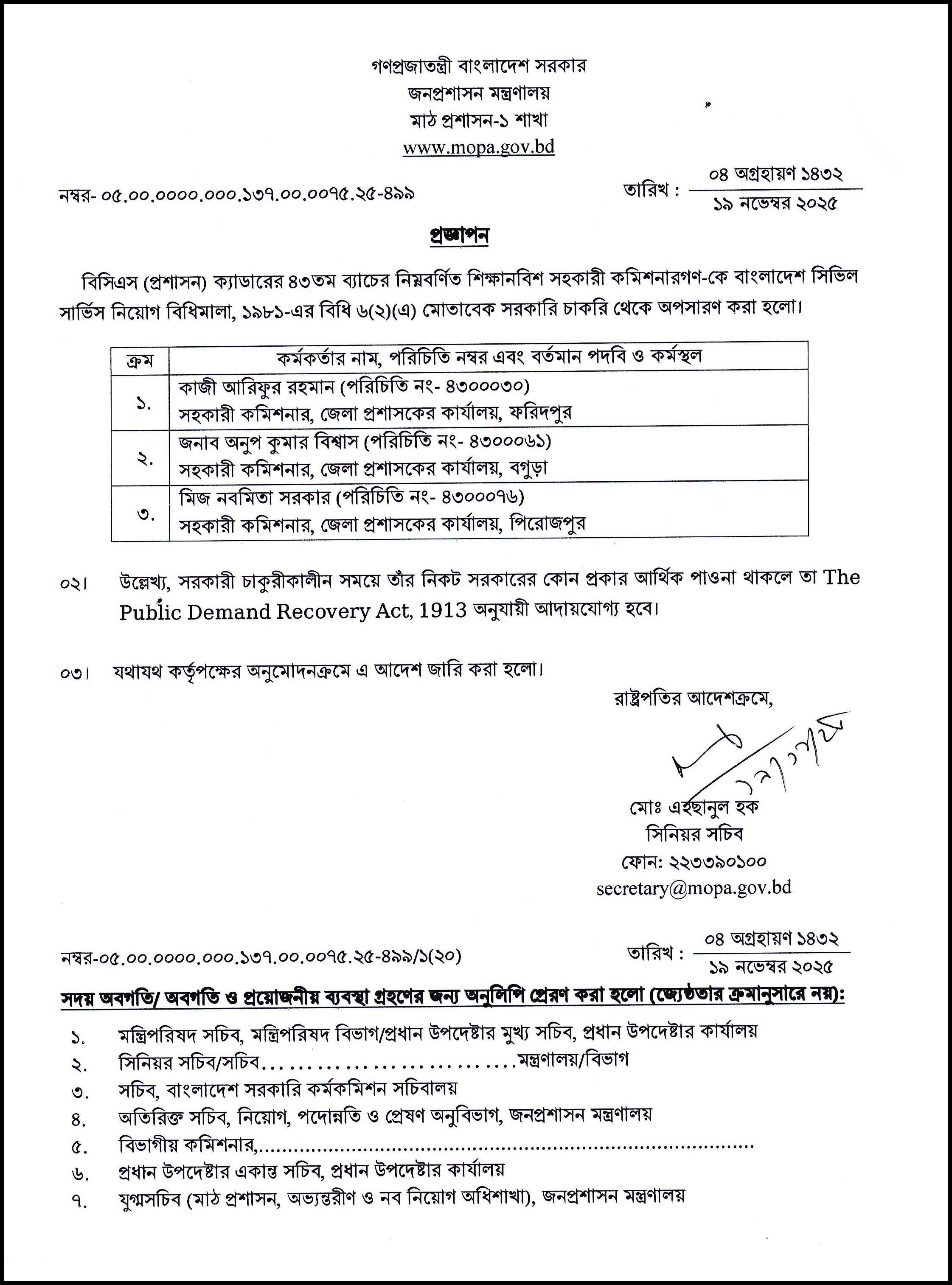 রাষ্ট্রপতির আদেশক্রমে সিনিয়র সচিব এহছানুল হক স্বাক্ষরিত প্রজ্ঞাপনে উল্লেখ করা হয়েছে, বিসিএস (প্রশাসন) ক্যাডারের ৪৩তম ব্যাচের এই শিক্ষানবিশ কর্মকর্তাদের বাংলাদেশ সিভিল সার্ভিস নিয়োগ বিধিমালা-১৯৮১–এর ৬(২)(এ) ধারা অনুসারে সরকারি চাকরি থেকে অপসারণ করা হয়েছে। চাকরিকালীন সময় সরকারের কাছে তাদের কোনো বকেয়া দায় থাকলে তা পাবলিক ডিমান্ড রিকভারি অ্যাক্ট, ১৯১৩ অনুযায়ী আদায় করা হবে।