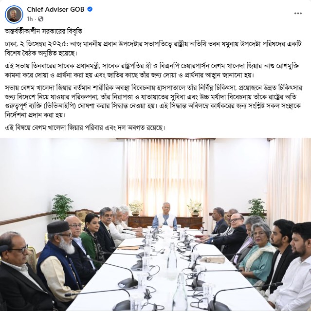 পরিকল্পনা উপদেষ্টা বলেন, সভায় খালেদা জিয়ার বর্তমান শারীরিক অবস্থা বিবেচনায় হাসপাতালে তার নির্বিঘ্ন চিকিৎসা, প্রয়োজনে উন্নত চিকিৎসার জন্য বিদেশে নিয়ে যাওয়ার পরিকল্পনা, তার নিরাপত্তা ও যাতায়াতের সুবিধা এবং উচ্চ মর্যাদা বিবেচনায় তাকে রাষ্ট্রের অতি গুরুত্বপূর্ণ ব্যক্তি (ভিভিআইপি) ঘোষণা করার সিদ্ধান্ত নেয়া হয়। এই সিদ্ধান্ত অবিলম্বে কার্যকরের জন্য সংশ্লিষ্ট সব সংস্থাকে নির্দেশনা প্রদান করা হয়।