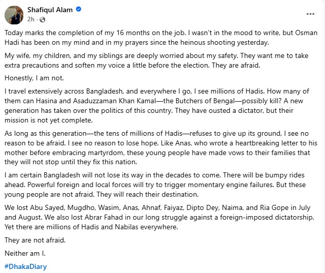 শনিবার (১৩ ডিসেম্বর) রাতে দেওয়া ওই ফেসবুক পোস্টে তিনি লেখেন, আজ আমার দায়িত্বের ১৬ মাস পূর্ণ হলো। লেখার মতো মানসিক অবস্থায় ছিলাম না। কিন্তু গতকালের নৃশংস গুলিবর্ষণের পর থেকে ওসমান হাদি আমার ভাবনায়, আমার দোয়ায়।