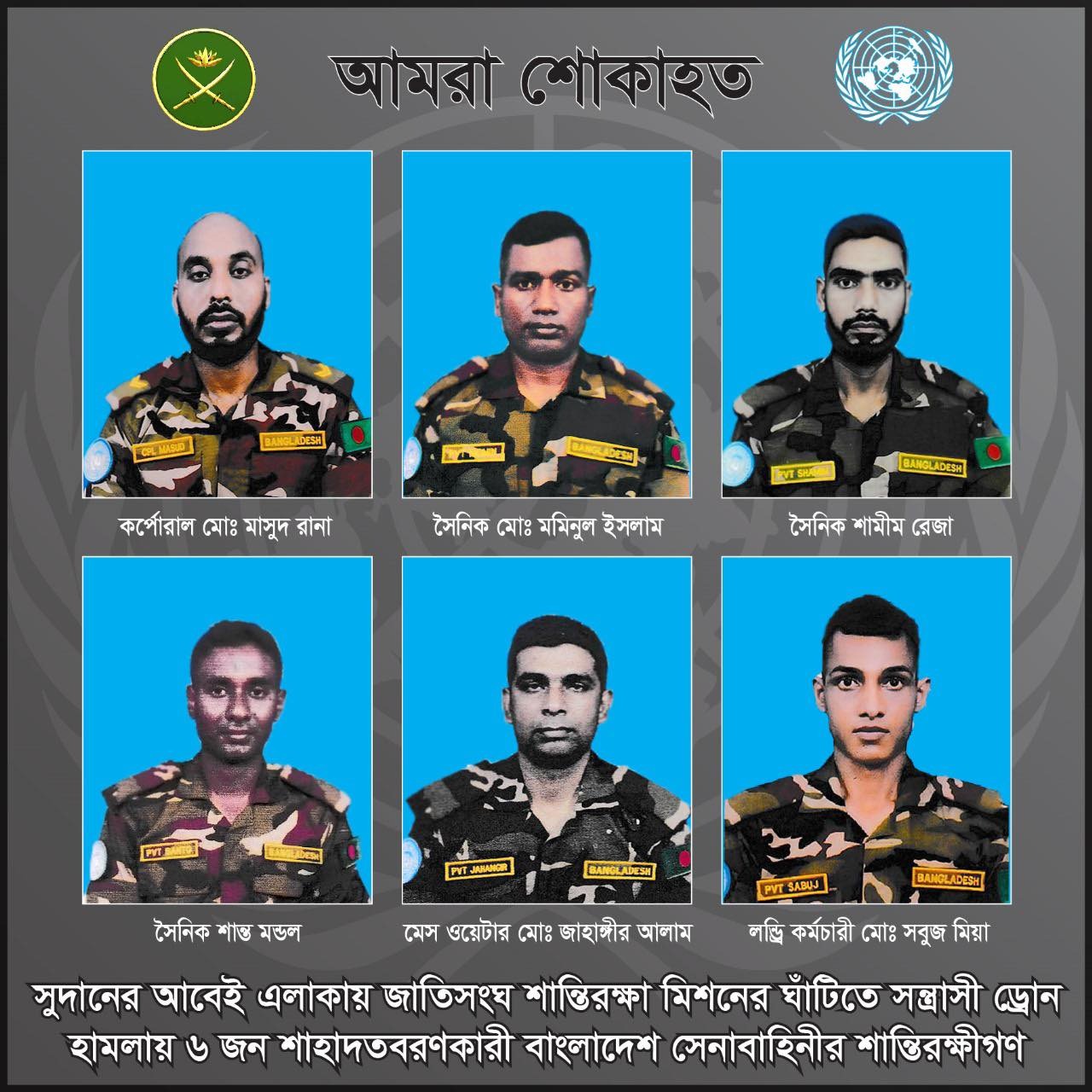 রোববার (১৪ ডিসেম্বর) আন্তঃবাহিনী জনসংযোগ পরিদপ্তর (আইএসপিআর) এক সংবাদ বিজ্ঞপ্তিতে জানায়, সুদানের আবেই এলাকায় জাতিসংঘ শান্তিরক্ষা মিশনের আওতাধীন কাদুগলি লজিস্টিক বেসে শনিবার স্থানীয় সময় আনুমানিক দুপুর ৩টা ৪০ মিনিট থেকে ৩টা ৫০ মিনিট পর্যন্ত বিচ্ছিন্নতাবাদী সশস্ত্র গোষ্ঠী ড্রোন হামলা চালায়। হামলায় দায়িত্বরত ছয়জন বাংলাদেশি শান্তিরক্ষী শহীদ হন। আহত হন আরও আটজন।