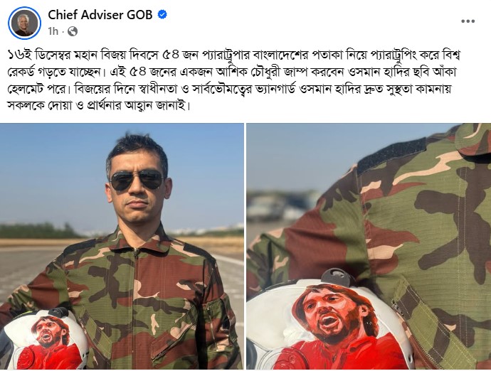 এতে বলা হয়, ‘১৬ই ডিসেম্বর মহান বিজয় দিবসে ৫৪ জন প্যারাট্রুপার বাংলাদেশের পতাকা নিয়ে বিশ্ব রেকর্ড গড়তে যাচ্ছেন। এই ৫৪ জনের একজন আশিক চৌধুরী জাম্প করবেন ওসমান হাদির ছবি আঁকা হেলমেট পরে। বিজয়ের দিনে স্বাধীনতা ও সার্বভৌমত্বের ভ্যানগার্ড ওসমান হাদির দ্রুত আরোগ্য কামনায় সকলকে দোয়া ও প্রার্থনার আহ্বান জানাই।’