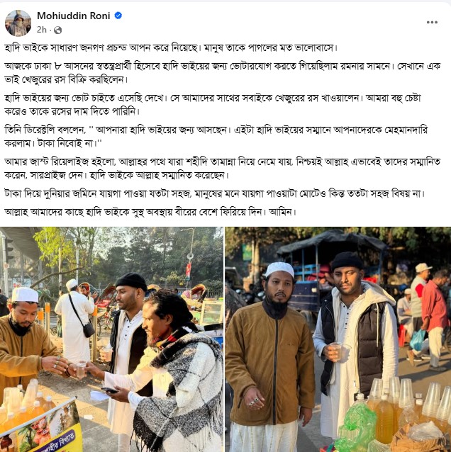 হাদির জন্য বহু মানুষ দোয়া করছে বলে জানান রনি। তিনি বলেন, বিশ্বাস করেন ভাই মানুষজন হাদি ভাইয়ের কথা শুনলেই বলে, ‘আমরা হাদির জন্য নামাজেও দোয়া করেছি। কত শত মানুষের কাছে যে এই একই কথা শুনেছি।