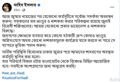 আজ জুম্মার নামাজের পর যেকোনো কর্মসূচীতে সর্বোচ্চ সতর্কতা অবলম্বন করুন। জুলাই বিরোধী শক্তিগুলোর গতকালের মত ভাংচুর ও নাশকতা করার পরিকল্পনা রয়েছে বলে সকলকে সতর্ক থাকাত আহ্বাবান জানিয়েছে জাতীয় নাগরিক পার্টির (এনসিপি) আহ্বায়ক নাহিদ ইসলাম।
