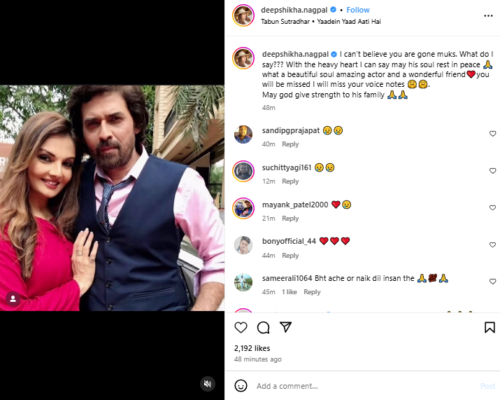 দীপশিখা ইনস্টাগ্রাম স্টোরিতে অভিনেতার একটি পুরনো ছবি শেয়ার করে লিখেছেন, RIP। মাত্র ৫৪ বছরে বন্ধু চলে গেল! এটা কি হল? আমি বিশ্বাস করতে পারছি না, মুকস।