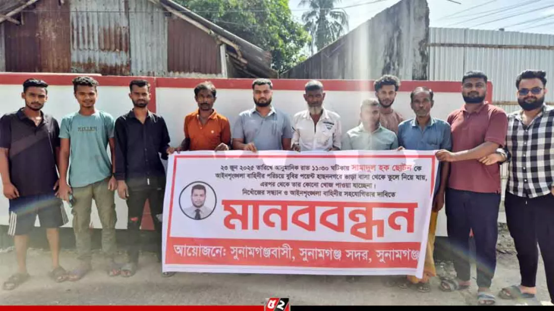 বৃহস্পতিবার (২৬ জুন) দুপুর ১২টার দিকে সুনামগঞ্জ ট্রাফিক পয়েন্টে 'সুনামগঞ্জবাসী' ব্যানারে ঘণ্টাব্যাপী এ মানববন্ধন অনুষ্ঠিত হয়।মানববন্ধনে নিখোঁজ যুবকের পরিবারসহ শতাধিক স্থানীয় বাসিন্দা অংশ নেন।