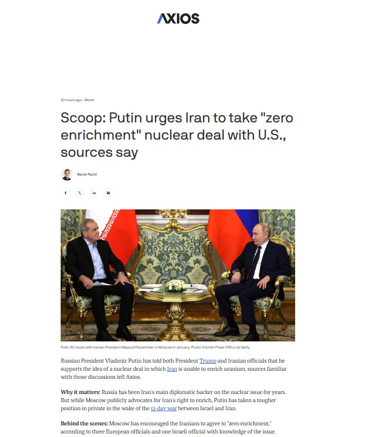 প্রতিবেদননে বলা হয়েছে, সম্প্রতি মার্কিন প্রেসিডেন্ট ডোনাল্ড ট্রাম্প ও ইরানের শীর্ষ কর্মকর্তাদের সঙ্গে আলাপে ‘শূন্য ইউরেনিয়াম সমৃদ্ধকরণ’ চুক্তির পক্ষে অবস্থান নিয়েছেন রাশিয়ার প্রেসিডেন্ট ভ্লাদিমির পুতিন। এক ইউরোপীয় কর্মকর্তা বলেছেন, পুতিন ব্যাপক উৎসাহ নিয়ে ইরানি প্রতিনিধিদের সামনে এই প্রস্তাবটি উপস্থাপন করেছিলেন, কিন্তু ইরানিরা তা স্পষ্টভাবে প্রত্যাখ্যান করেছে।