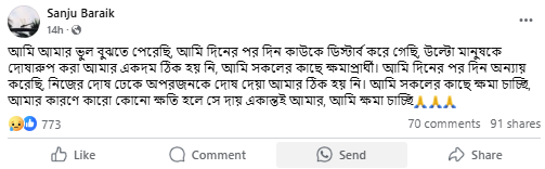 ঘটনার আগে নিজের ফেসবুক প্রোফাইলে একটি স্ট্যাটাস দিয়েছিলেন সঞ্জু। সেখানে তিনি লেখেন - আমি আমার ভুল বুঝতে পেরেছি। দিনের পর দিন কাউকে ডিস্টার্ব করে গেছি, উল্টো মানুষকে দোষারোপ করেছি। এটা একদম ঠিক হয়নি। আমি সকলের কাছে ক্ষমা চাচ্ছি। আমার কারণে কারও কোনও ক্ষতি হয়ে থাকলে তার দায় আমার একান্ত নিজের।
