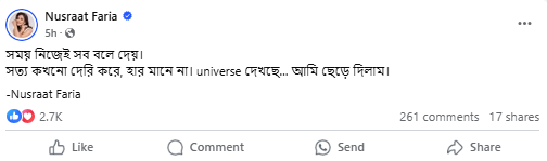 পোষ্টে তিনি লিখেছেন, সময় নিজেই সব বলে দেয়। সত্য কখনো দেরি করে, হার মানে না। মহাবিশ্ব দেখছে, আমি ছেড়ে দিলাম।
