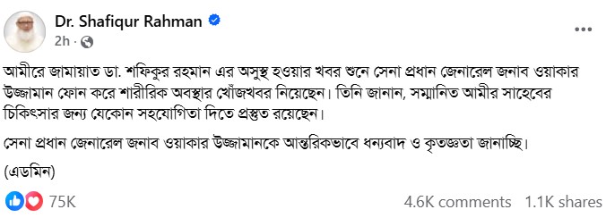 ফেসবুকে অ্যাডমিন লিখেছেন, আমিরে জামায়াত ডা. শফিকুর রহমানের অসুস্থ হওয়ার খবর শুনে সেনাপ্রধান জেনারেল ওয়াকার-উজ-জামান ফোন করে শারীরিক অবস্থার খোঁজ খবর নিয়েছেন।