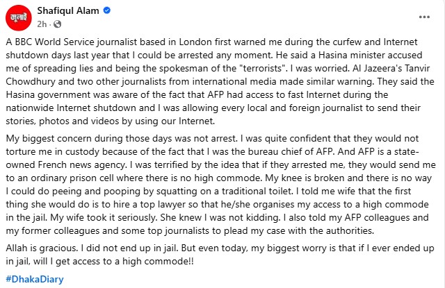 ফেসবুকে প্রেস সচিব শফিকুল আলম লেখেন, গত বছরের কারফিউ ও ইন্টারনেট শাটডাউনের সময় লন্ডনভিত্তিক বিবিসি ওয়ার্ল্ড সার্ভিসের এক সাংবাদিক প্রথম আমাকে সতর্ক করেন, যেকোনো মুহূর্তে আমাকে গ্রেপ্তার করা হতে পারে। তিনি (বিবিসির সাংবাদিক) বলেন, হাসিনা সরকারের এক মন্ত্রী আমাকে মিথ্যা প্রচারের অভিযোগে এবং ‘সন্ত্রাসীদের মুখপাত্র’ হিসেবে অভিযুক্ত করেছেন। আমি তখন উদ্বিগ্ন হয়ে পড়ি। আল জাজিরার তানভীর চৌধুরী এবং আরও দুজন আন্তর্জাতিক গণমাধ্যমকর্মী একই রকম সতর্কবার্তা দেন। তারা বলেন, হাসিনা সরকার জানে যে, ইন্টারনেট শাটডাউনের সময়েও এএফপির দ্রুতগতির ইন্টারনেট চালু ছিল এবং আমি দেশি-বিদেশি সাংবাদিকদের সেই ইন্টারনেট ব্যবহার করে তাদের রিপোর্ট, ছবি ও ভিডিও পাঠাতে সহায়তা করছিলাম।