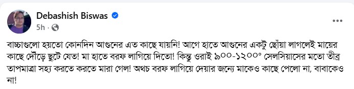 সামজিকমাধ্যমে এক শোকবার্তায় নির্মাতা ও উপস্থাপক দেবাশীষ বিশ্বাস লিখেন, বাচ্চাগুলো হয়তো কোনদিন আগুনের এত কাছে যায়নি! আগে হাতে আগুনের একটু ছোঁয়া লাগলেই মায়ের কাছে দৌঁড়ে ছুটে যেত! মা হাতে বরফ লাগিয়ে দিতো! কিন্তু ওরাই ৯০০-১২০০° সেলসিয়াসের মতো তীব্র তাপমাত্রা সহ্য করতে করতে মারা গেল! অথচ বরফ লাগিয়ে দেয়ার জন্যে মাকেও কাছে পেলো না, বাবাকেও না!