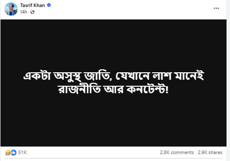 সামাজিক যোগাযোগমাধ্যমে দেওয়া এক পোস্টে তিনি লেখেন, “একটা অসুস্থ জাতি, যেখানে লাশ মানেই রাজনীতি আর কনটেন্ট।”