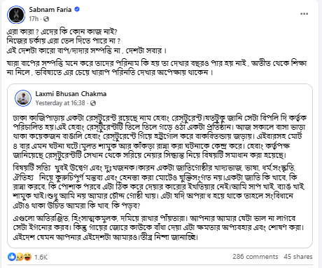 অন্য একজন মন্তব্য করেন, "এমন একটি রেস্টুরেন্ট যেখানে পাহাড়ি খাবার মেন্যুতে ছিল, সেটি বন্ধ করা অযৌক্তিক এবং আমাদের বিশ্বাসের পরিপন্থী।" কিছু মন্তব্যকারী এটিকে "বাড়াবাড়ি" এবং "অত্যন্ত দুঃখজনক" বলে উল্লেখ করেছেন, কারণ তারা মনে করেন যে এ ধরনের কর্মকাণ্ড দেশের শান্তি ও ঐক্যকে ক্ষতিগ্রস্ত করছে।
