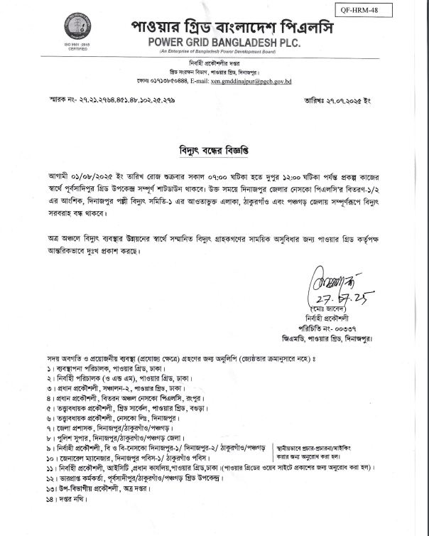 বিজ্ঞপ্তিতে বলা হয়, ১ আগস্ট সকাল ৭টা থেকে বেলা ১২টা পর্যন্ত পূর্বসাদিপুর গ্রিড উপকেন্দ্র সম্পূর্ণ শাটডাউন থাকবে। ফলে ওই সময়ে দিনাজপুর জেলার নেসকো বিতরণ-১/২ এর আংশিক, দিনাজপুর পল্লী বিদ্যুৎ সমিতি-১ এর আওতাভুক্ত এলাকা, ঠাকুরগাঁও এবং পঞ্চগড় জেলায় সম্পূর্ণরূপে বিদ্যুৎ সরবরাহ বন্ধ থাকবে।