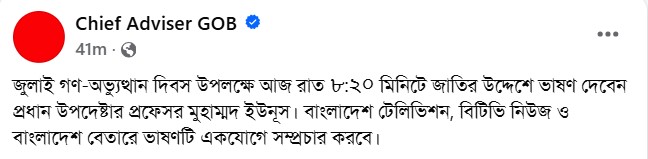 বিজ্ঞপ্তিতে বলা হয়, জুলাই গণ-অভ্যুত্থান দিবস উপলক্ষে আজ (মঙ্গলবার) রাত ৮টা ২০ মিনিটে জাতির উদ্দেশে ভাষণ দেবেন প্রধান উপদেষ্টা প্রফেসর মুহাম্মদ ইউনূস। বাংলাদেশ টেলিভিশন, বিটিভি নিউজ ও বাংলাদেশ বেতারে ভাষণটি একযোগে সম্প্রচার করবে।