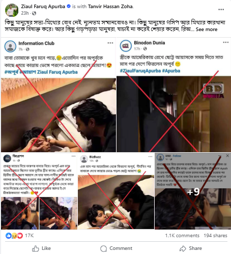 একটি ফেসবুক পোস্টে অপূর্ব লিখেছেন, "কিছু মানুষের সত্য-মিথ্যার বোধ নেই, ন্যূনতম সম্মানবোধও নেই।" তিনি আরও বলেন, "সন্তানের প্রতি বাবা-মায়ের ভালোবাসা নিয়ে আজেবাজে মন্তব্য করা অত্যন্ত অমানবিক এবং লজ্জাজনক।"