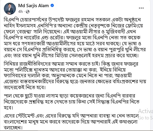 বিএনপি চেয়ারপার্সনের উপদেষ্টা ফজলুর রহমান গতকাল একটা অনুষ্ঠানে নাহিদ ইসলামসহ এনসিপি'র অন্যান্য কেন্দ্রীয় নেতৃবৃন্দকে নিজের ফ্রেমিংয়ে ফেলে 'বেজন্মা' গালি দিয়েছেন। এই আওয়ামী লীগার ও মুজিববাদী এখন বিএনপি'র ন্যারেটর এন্ড ওরেটর। ফজলুর মতো বিএনপি নেতা গত কয়েক মাস ধরে গণহত্যাকারী আওয়ামীলীগের হয়ে মাঠে সরব থাকছে। যে ভাষা ও বয়ানে সে বিএনপির প্রতিনিধিত্ব করছে, সে ভাষা ও বয়ান পুরাপুরি খুনি লীগের এবং তার বয়ান খুনি লীগের মিডিয়া সেলগুলোই হরদম প্রচার করে যাচ্ছে।