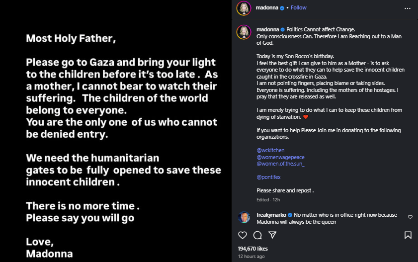 ম্যাডোনা ইনস্টাগ্রামে এক পোস্টে লেখেন, "একজন মা হিসেবে আমি তাদের কষ্ট সহ্য করতে পারছি না। এই শিশুরা আমাদের সবার।" তিনি আরও যোগ করেন, "আপনিই একমাত্র ব্যক্তি, যাকে গাজায় প্রবেশে বাধা দেওয়া যাবে না। এই মানবিক বিপর্যয় থেকে শিশুদের বাঁচাতে আমাদের দরজা সম্পূর্ণরূপে খুলে দিতে হবে।"