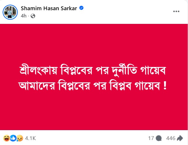 মঙ্গলবার (১২ জুলাই) নিজের ফেসবুক পেজে দেওয়া এক পোস্টে শামীম হাসান লিখেছেন— শ্রীলংকায় বিপ্লবের পর দুর্নীতি গায়েব। আমাদের বিপ্লবের পর বিপ্লব গায়েব!
