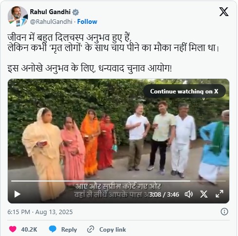 সম্প্রতি সামাজিক যোগাযোগমাধ্যমে ‘মৃত’ ভোটারদের সঙ্গে চা পান করার একটি ভিডিও প্রকাশ করেছেন কংগ্রেস নেতা রাহুল গান্ধী। ভিডিওর ক্যাপশনে রাহুল লিখেছেন— এটি তার জীবনের অভূতপূর্ব অভিজ্ঞতা। মূলত, ভারতে ভোটার তালিকা তৈরিতে অনিয়ম ও অসঙ্গতি নিয়ে বিভিন্ন তথ্য-প্রমাণ প্রকাশ করছেন রাহুল গান্ধী। মৃত ভোটারদের সঙ্গে চা পানের ভিডিওটি তার সেই কার্যক্রমেরই অংশ।