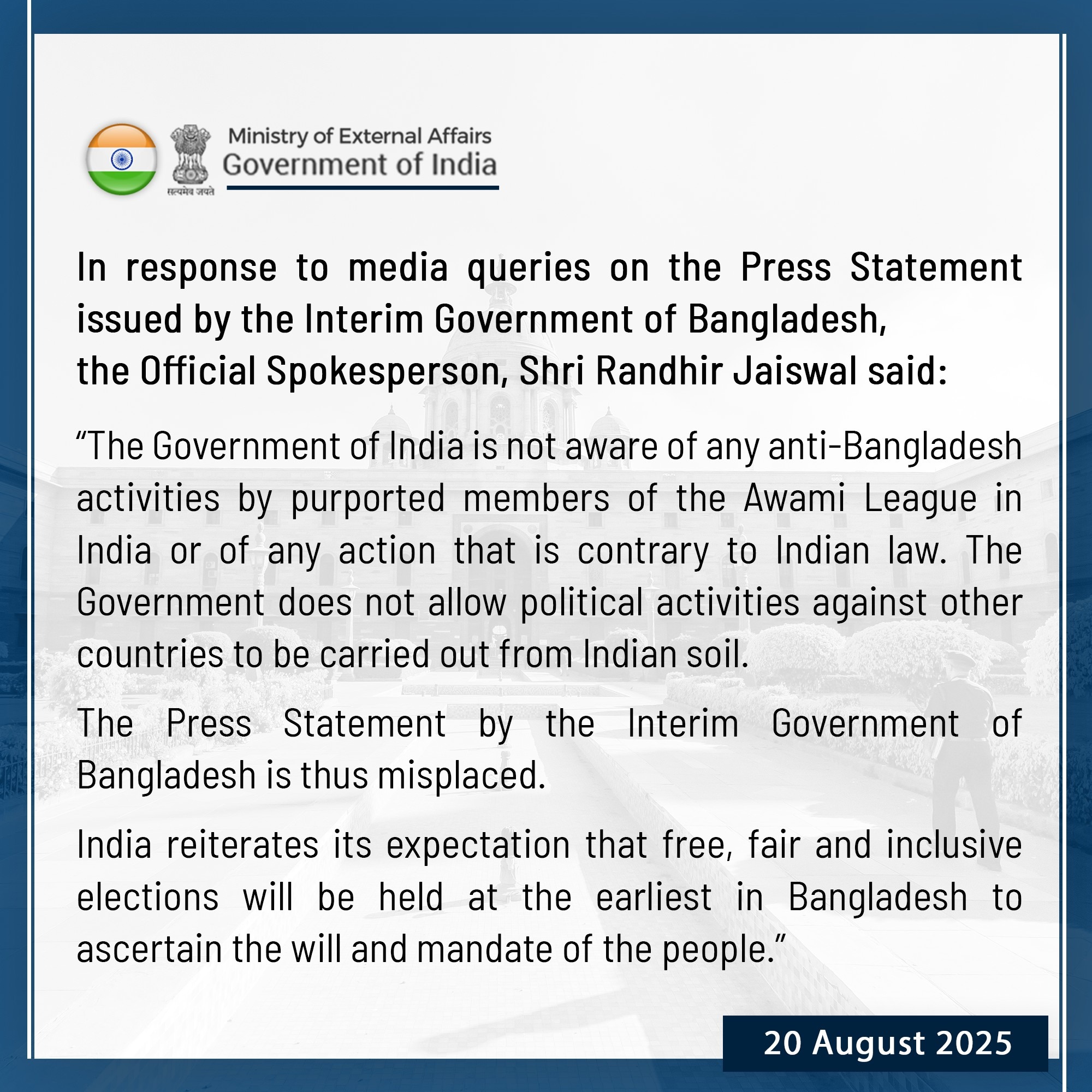 ভারতের বিবৃতিতে বলা হয়, ভারতে আওয়ামী লীগের সদস্যদের দ্বারা বাংলাদেশবিরোধী কোনও কার্যকলাপ বা ভারতীয় আইনের পরিপন্থি কোনও কর্মকাণ্ড সম্পর্কে ভারত সরকার অবগত নয়। সরকার ভারতের মাটি থেকে অন্য দেশের বিরুদ্ধে রাজনৈতিক কার্যকলাপ পরিচালনার অনুমতি দেয় না। বাংলাদেশের অন্তর্বর্তী সরকারের দাবি সঠিক নয়।