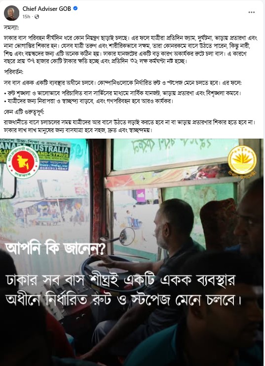 পোস্টে বলা হয়, ঢাকার বাস দীর্ঘদিন ধরে কোনো নিয়ন্ত্রণ ছাড়াই চলছে। ফলে যাত্রীরা প্রতিদিন যানজট, দুর্ঘটনা, ভাড়ায় প্রতারণা এবং নানা ভোগান্তির শিকার হন। যেসব যাত্রী তরুণ ও শারীরিকভাবে সক্ষম, তাঁরা কোনো রকমে বাসে উঠতে পারেন। কিন্তু নারী, শিশু ও বয়স্কদের জন্য এটি অনেক কঠিন হয়। এ ছাড়া ঢাকার যানজটের একটি বড় কারণ অকার্যকর রুটে চলাচল করা বাস। এ কারণে বছরে প্রায় ৩৭ হাজার কোটি টাকার ক্ষতি হয়। প্রতিদিন ৩২ লাখ কর্মঘণ্টা নষ্ট হয়।