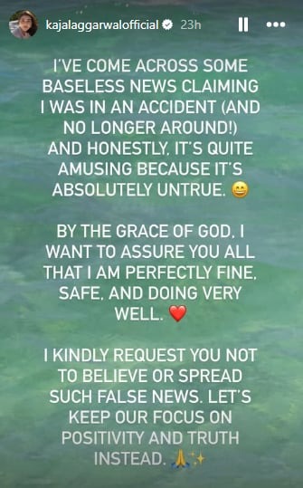 ইনস্টাগ্রাম স্টোরিতে এক পোস্টে কাজল লিখেছেন, ‘আমার সড়ক দুর্ঘটনায় মৃত্যু হয়েছে বলে গুজব রটানো হচ্ছে। আসলে বিষয়টি হাস্যকর ও সম্পূর্ণ অসত্য। আল্লাহর কৃপায় আমি সুস্থ আছি। সবাইকে অনুরোধ করছি, এমন ভুয়া খবরে বিভ্রান্ত না হয়ে ইতিবাচক ও সত্য তথ্যের ওপর গুরুত্ব দিন।’