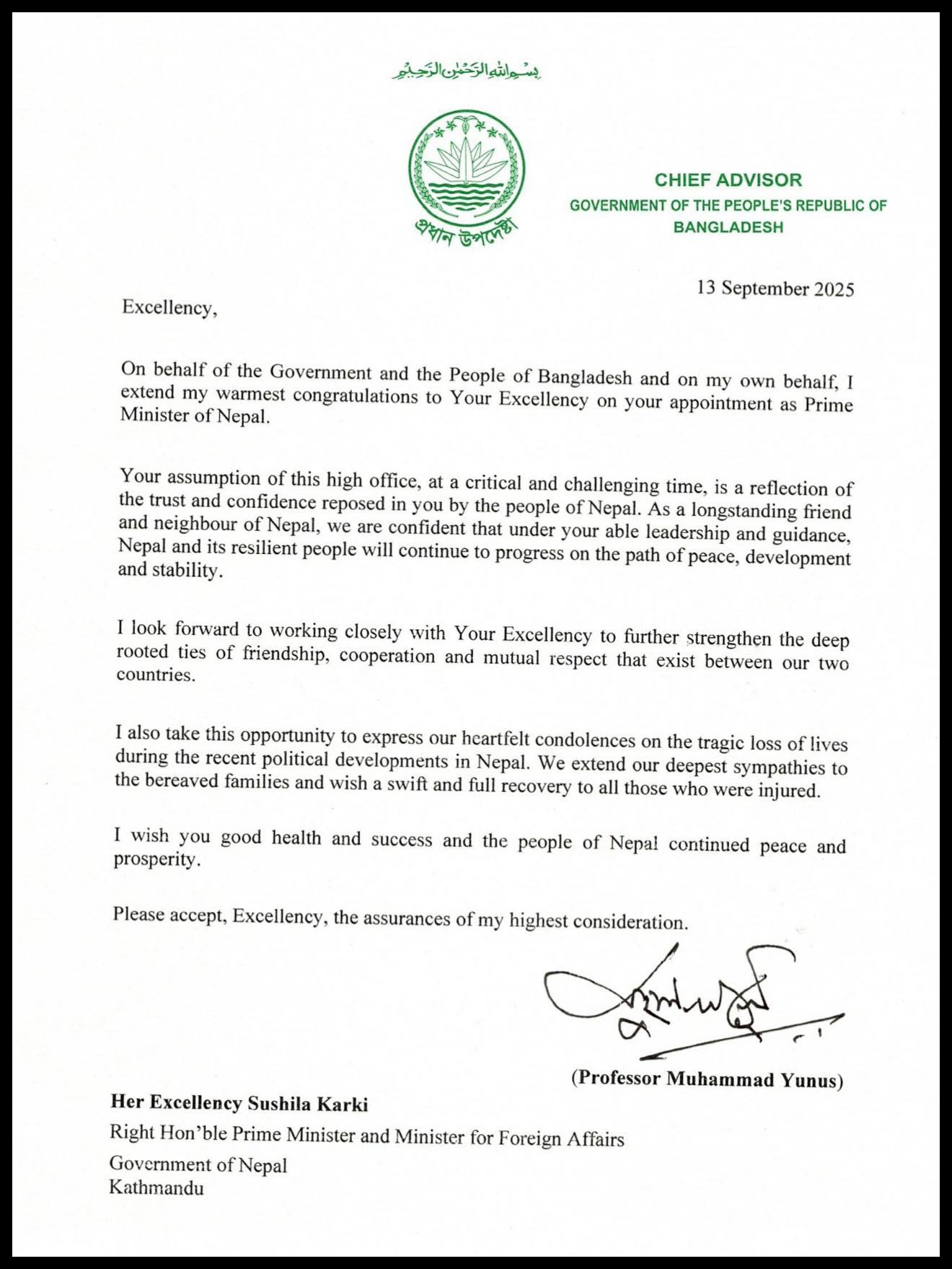 প্রধান উপদেষ্টা বলেন, “বাংলাদেশ সরকার ও জনগণের পক্ষ থেকে এবং ব্যক্তিগতভাবে আমি আপনার নেতৃত্বের প্রতি পূর্ণ আস্থা রাখি। বিশেষ করে এই কঠিন সময়ে আপনার নিয়োগ নেপালের জনগণের আস্থা ও বিশ্বাসের প্রতিফলন।”