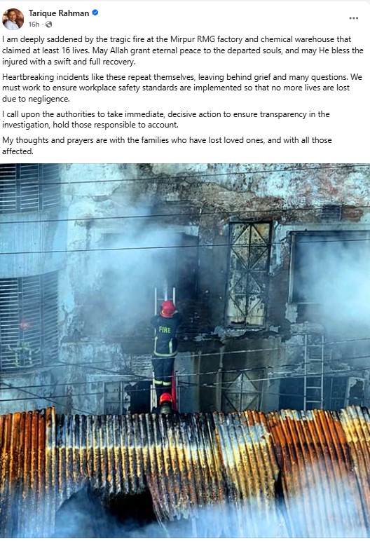 পোস্টে তারেক রহমান লেখেন, মিরপুরের আরএমজি কারখানা ও রাসায়নিক গুদামে ভয়াবহ অগ্নিকাণ্ডে কমপক্ষে ১৬ জনের প্রাণহানির ঘটনায় আমি গভীরভাবে শোকাহত। আল্লাহ নিহতদের আত্মার চির শান্তি দান করুন এবং আহতদের দ্রুত ও পূর্ণ সুস্থতা দান করুন।
