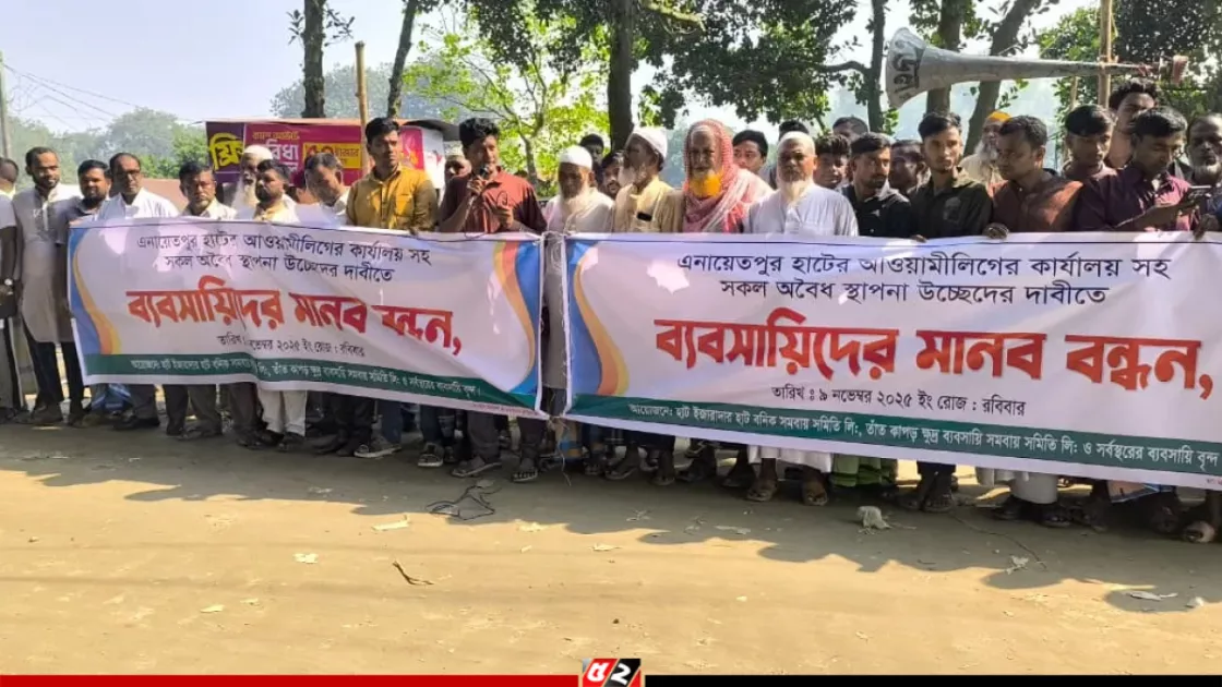 এনায়েতপুর হাট ইজারাদার, হাট বণিক সমবায় সমিতি লিমিটেড এবং তাঁত কাপড় ক্ষুদ্র ব্যবসায়ী সমবায় সমিতি লিমিটেডের যৌথ উদ্যোগে আয়োজিত এ মানববন্ধনে শতাধিক ব্যবসায়ী অংশ নেন।