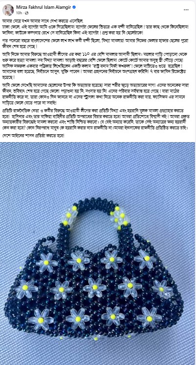 পোস্টে তিনি আওয়ামী লীগ সরকারের আমলে বিরোধী দলের নেতাকর্মীদের বিরুদ্ধে দায়ের করা মিথ্যা মামলা, জেল-জুলুম এবং ব্যক্তিগত কষ্টের কথা তুলে ধরেছেন। পাশাপাশি, কারাগার থেকে তার মেয়ের জন্য কেনা একটি ব্যাগের আবেগঘন স্মৃতিও তিনি বর্ণনা করেছেন।