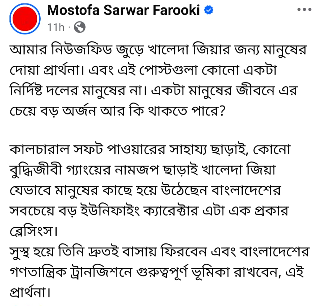 মোস্তফা সরয়ার ফারুকী পোস্টে লিখেছেন, ‘আমার নিউজফিড জুড়ে খালেদা জিয়ার জন্য মানুষের দোয়া প্রার্থনা এবং এই পোস্টগুলা কোনো একটা নির্দিষ্ট দলের মানুষের না। একটা মানুষের জীবনে এর চেয়ে বড় অর্জন আর কি থাকতে পারে?’