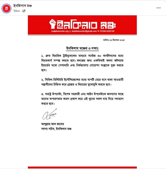 সরকারকে ২৪ ঘণ্টার আল্টিমেটাম দিয়ে দুটি প্রধান দাবি তোলে ইনকিলাব মঞ্চ।