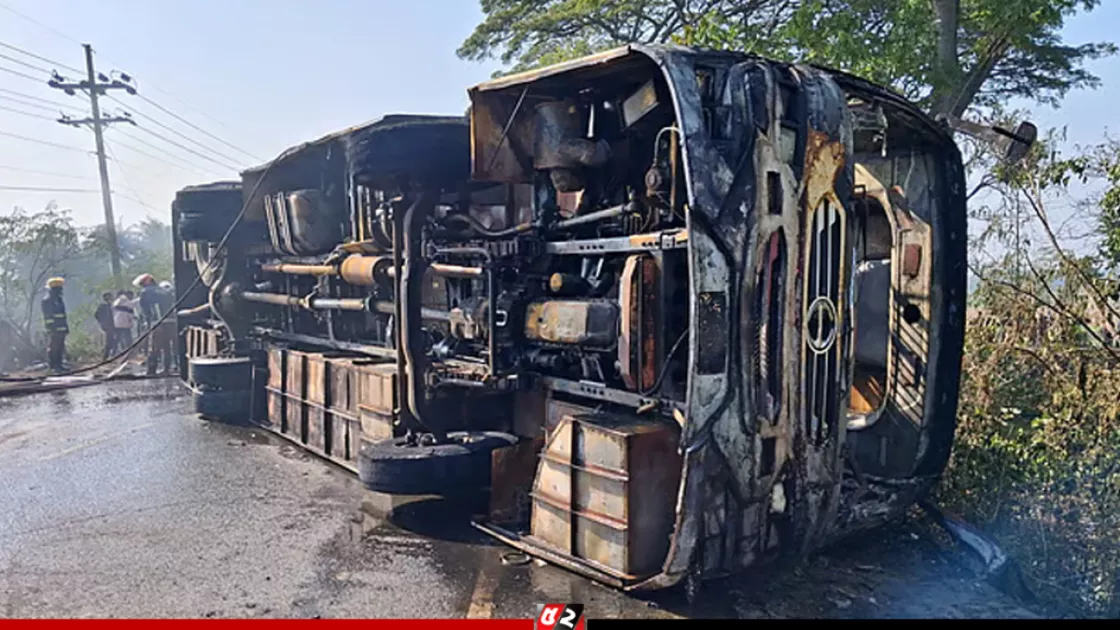 এ নিয়ে চালক, তাঁর সহকারীর সঙ্গে ওই ব্যক্তির বাগ্বিতণ্ডা হয়। এ সময় বাসের চালক অমনোযোগী হয়ে যান। মহাসড়কের চট্টগ্রামগামী লেনে বানিয়াপাড়া এলাকায় বাসের চালক একটি মোটরসাইকেল ও ব্যাটারিচালিত রিকশা অতিত্রুম করতে গেলে বাসটি নিয়ন্ত্রণ হারিয়ে উল্টে আগুন ধরে যায়।
