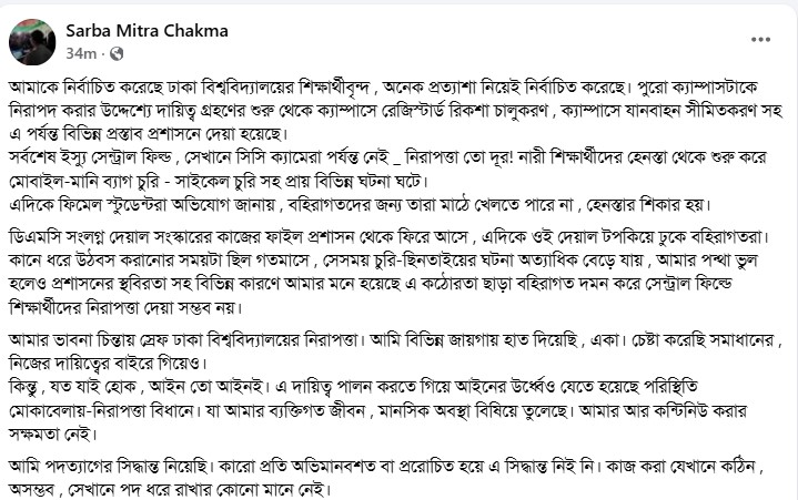 সোমবার (২৬ জানুয়ারি) ডাকসু-২ নামের ফেসবুক পেজে দেওয়া এক দীর্ঘ পোস্টে সর্বমিত্র চাকমা এই ঘটনার জন্য ক্ষমা চান এবং পুরো বিষয়টির পেছনের প্রেক্ষাপট ব্যাখ্যা করেন।
