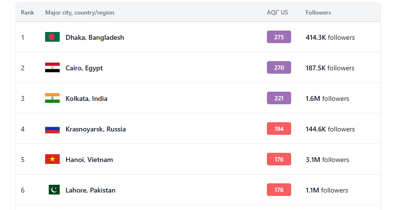 বায়ু দূষণের তালিকায় শীর্ষে থাকা ঢাকার স্কোর ২৭৫। যা খুব অস্বাস্থ্যকর। তালিকায় দুই নম্বরে আছে মিশরের কাইরো শহর। এখানকার বাতাসের স্কোর ২৭০। ২২১ স্কোর নিয়ে তালিকার তিন নম্বরে অবস্থান করছে ভারতের কলকাতা।