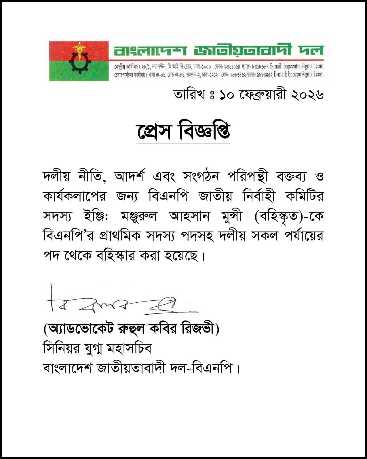 বিজ্ঞপ্তিতে বলা হয়, দলীয় নীতি, আদর্শ ও সংগঠনবিরোধী বক্তব্য এবং কার্যকলাপের কারণে বিএনপির জাতীয় নির্বাহী কমিটির সদস্য মঞ্জুরুল আহসান মুন্সীকে দলের প্রাথমিক সদস্যপদসহ সব পর্যায়ের পদ থেকে বহিষ্কার করা হয়েছে।