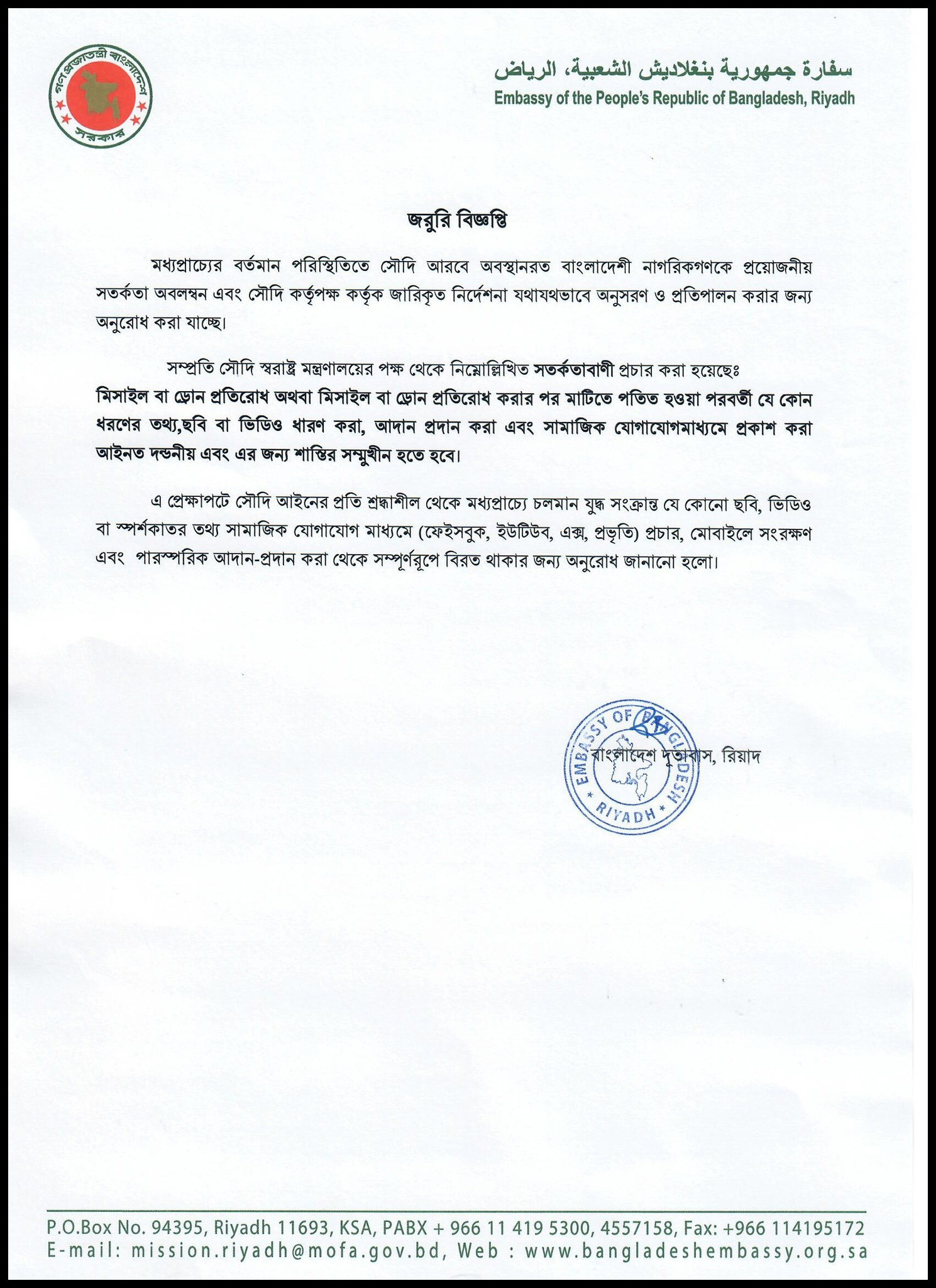 বিজ্ঞপ্তিতে বলা হয়েছে, যুদ্ধসংক্রান্ত কোনো ছবি বা ভিডিও ধারণ, সংরক্ষণ কিংবা সামাজিক যোগাযোগমাধ্যমে প্রচার করা থেকে বিরত থাকতে হবে। সৌদি স্বরাষ্ট্র মন্ত্রণালয়ের সতর্কবার্তা অনুযায়ী, ক্ষেপণাস্ত্র বা ড্রোন প্রতিরোধ কিংবা সেগুলোর ধ্বংসাবশেষের ছবি-ভিডিও ধারণ ও প্রচার আইনত দণ্ডনীয় অপরাধ।
